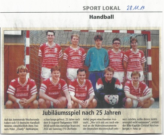 „Da wurden wir bei der Ankunft in Werries vom ganzen Stadtbezirk begrüßt. Die Polizei hatte die Braamer Straße abgesperrt, der Spielmannzug war vollständig angetreten und selbst die Feuerwehr sowie gefühlte 1000 Freunde, Fans und Handballinteressenten standen zum Empfang parat“, erinnert sich Christof Reichenberger, der damalige Mannschaftskapitän, noch heute an die bewegenden Momente. Der Titelgewinn der B-Junioren liegt nunmehr schon 25 Jahre zurück, doch das Team will mit einem Treffen diese schöne Zeit noch einmal aufleben lassen. „Wir kommen am 29. November noch einmal zusammen und werden um 15 Uhr in der Freiherr-vom-Stein Halle ein Freundschaftsspiel gegen eine Auswahl des ASV Hamm bestreiten. Diese Mannschaft stellt sich aus Spielern zusammen, die damals zum Kader der ersten- oder zweiten Mannschaft zählten, ergänzt durch Akteure, die uns auf dem damaligen Weg begleitet haben. Das wird eine richtig runde Sache“, verspricht Christof Reichenberger, der das Erinnerungstreffen maßgeblich geplant hat. Bereits vor dem Spiel treffen sich die „ASV Helden von 89“ im Vereinsraum an der Stein-Halle.
